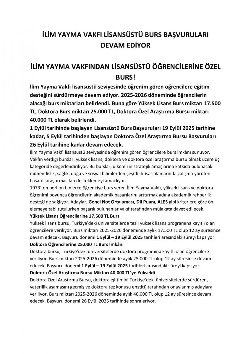 İlim Yayma Vakfı Burs Duyurusu