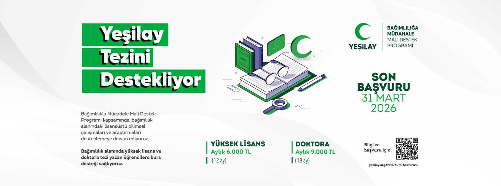Yeşilay, bağımlılıklarla mücadelede ulusal ve uluslararası düzeyde yürütülecek çalışmalara kaynak teşkil edebilecek, bağımlılık alanında yazınını geliştirebilecek, politika ve eylem planlarının oluşturulmasına katkıda bulunabilecek bilimsel araştırmaların artmasına ve genç araştırmacıların yetişmesine katkıda bulunmayı hedefliyor. Buradan hareketle yola çıkan Yeşilay, bağımlılıkla mücadelede ulusal ve uluslararası düzeyde kaynak oluşturabilecek, sağlık bilimlerinden sosyal bilimlere kadar birçok alanda hazırlanacak nitel ve nicel araştırmaların desteklenmesi için 2014 yılından bu yana Lisansüstü Tez Araştırma Bursu Destek Programı ile bağımlılıklar alanında yapılacak tez çalışmalarına destek veriyor. Yüksek Lisans öğrencilerine 12 ay süreyle 6000 TL, Doktora ve Tıpta Uzmanlık öğrencilerine 18 ay süreyle 9000 TL burs desteği verilecek burs programı için son başvuru tarihi 31 Mart 2026.